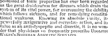 possessed of tonic properties has ever been regarded as the great clcaUlcratitm for diseases which drain the system of its vital power, for overcomingl the debility which follows sickness, and for remedying constitutional weakness. Knowing its absolute l urity, its powerfully invigorative and corrective action, ai;d its value as an anti-dyspeptic and diuretic, it is no wonder that physicians f-o frequently prescribe Udolpjio ■Wolfe's Schiedam Aromatic Schnapps,