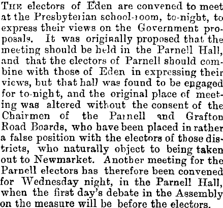 The electors of Etten are convened to meet at the Presbyteiian school-room, to-night, to express their views on the Government proposals. It was originally proposed that the meeting should be held in the Parnell Hall, and that the electors of Parnell should combine with those of Eden in expressing their views, but thathalJ was found to be epgaged for to-night, and the original place of meeting was altered without the consent of the Chairmen of the Painell md Grafton Koad Boards, who have been placed in rather a false position with the electors of those districts, who naturally object to being taken out to Newmarket. Another meeting for the Parnell electors has therefore been convened for Wednesday night, in the Parnell Hall, when the first day's debate in the Assembly on the measure will be before the electors.