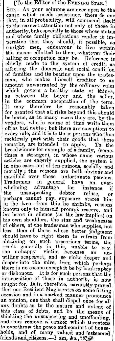 [To the Editor of the Evening Star.] Sib, —As your columns are ever open to the cause which needs assistance, there is one that, in all probability, will commend itself to the earnest attention not only of those in authority, but especially to those whose status and whose family obligations render it imperative that they should, if possible, as upright men, endeavour to live within the means allotted to them, whatever their calling or occupation may be. Reference is chiefly made to the system of credit, as affecting the domestic and social condition of families and its bearing upon the tradesman, who make 3 himself creditor to an amount unwarranted by the ordinary rules which govern a healthy state of things, as between the buyer and the seller^ !in the common acceptation of the term. It may therefore be reasonably taken for granted that all risks beyond this should be borne, as in many cases they are, by the vendors, who in course of time write them off as bad debts-; but there are exceptions to every rule, and it is to those persons who thus recklessly part with their goods that these remarks, are intended to apply. To the breadwinner for example of a family, (sometimes a stranger), in whose name various articles are eagerly supplied, the system is in nine cases out of ten ruinous, socially and morally ; the reasons are both obvious and manifold over these unfortunate persons. Tradesmen in general have an overwhelming advantage for instance if the unsuspecting debtor refuse, or perhaps cannot pay, exposure stares him in the face--from this he shrinks, reasons known only to himself prompt reserve, and he bears in silence (as the law Implies) on his own shoulders, the sins and weaknesses of others, of the tradesman who supplies, not less than of those whose better judgment should have to right them to refrain from obtaining on such precarious terms, the result generally is this, unable to pay, the unhappy victim becomes an unwilling scapegoa,t, and so sinks deeper and deeper into the mire, from which perhaps there is no escape except it be by bankruptcy or dishonour. It is for such persons that the interposition of those in authority is now sought for. It is, therefore, earnestly prayed that our Resident Magistrates on some fitting occasion and in a marked manner pronounce an opinion, one that shall dispel once for all any doubts as to the nature and extent of this class of debts, and be the means of shielding the unsuspecting and unoffending, and thus remove a canker which threatens to overthrow the peace and comfort of households, and of many valued and festeemed friends and —I am, £c.,^f£l3