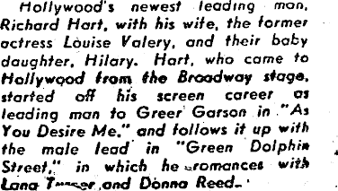 66Hollywood's newest leading man. Richard Hart, with his wife, the former actress Louise Valery, and their baby daughter, Hilary. Hart, who came to Hollywood from the Broadway stage, started off his screen career as leading man to Greer Garson in "As You Desire Me." and follows it up with the male lead in "Green Dolphin Street," in which he romances with Lana Tuer and Donna Reed. Bay of Plenty Beacon, Volume 12, Issue 60, 25 June 1948, Page 3