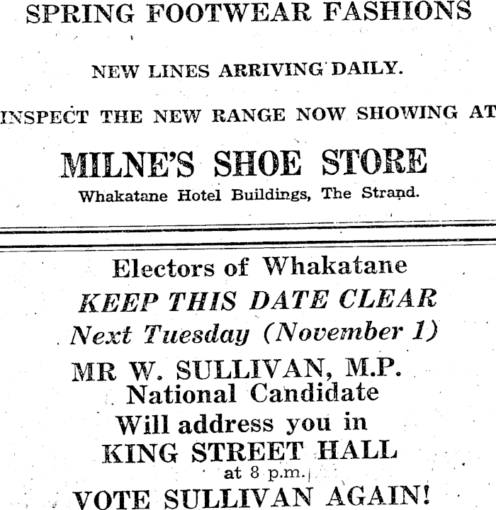 SPRING FOOTWEAR FASHIONS NEW LINES ARRIVING' DAILY. INSPECT THE NEW RANGE NOW SHOWING AT MILNE’S SHOE STORE Whakatane Hotel Buildings, The Strand. Electors of Whakatane KEEP THIS DATE CLEAR Next Tuesday (November 1) MR W. SULLIVAN, M.P. National Candidate Will address you in KING STREET HALL at 8 p.m. | VOTE SULLIVAN AGAIN!