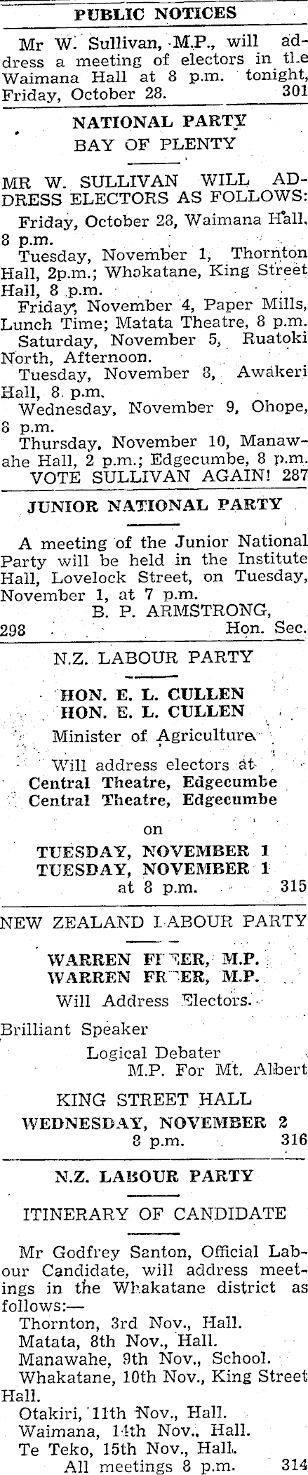 PUBLIC NOTICES Mr W. Sullivan, -M.P., will address a meeting of electors in tl.e Waimana Hall at 8 p.m. tonight, Friday, October 28. 301 NATIONAL PARTY BAY OF PLENTY MR W. SULLIVAN WILL ADDRESS ELECTORS AS FOLLOWS: Friday, October 28, Waimana Hall, 8 p.m. Tuesday, November 1, Thornton Hall, 2p.m.; Whakatane, King Street Hall, 8 p.m. • Friday 4 , November 4, Paper Mills, Lunch Time; Matata Theatre, 8 p.m. Saturday, November 5, Ruatoki North, Afternoon. Tuesday, November 8, Awakeri Hall, 8 p.m. Wednesday, November 9, Ohope, 8 p.m. Thursday, November 10, Manawahe Hall, 2 p.m.; Edgecumbe, 8 p.m. VOTE SULLIVAN AGAIN! 287 JUNIOR NATIONAL PARTY A meeting of the Junior National Party will be held in the Institute Hall, Lovelock Street, on Tuesday, November 1, at 7 p.m. B. P. ARMSTRONG, 298 ' Hon. Sec. N.Z. LABOUR PARTY HON. E. L. CULLEN HON. E. L. CULLEN Minister of Agriculture, Will address electors at ’ Central Theatre, Edgecumbe Central Theatre, Edgecumbe on TUESDAY, NOVEMBER 1 TUESDAY, NOVEMBER 1 at 8 p.m. 315 NEW ZEALAND LABOUR PARTY WARREN FFEER, M.P. WARREN FR "ER, M.P. Will Address Electors. Brilliant Speaker Logical Debater M.P. For Mt. Albert KING STREET HALL WEDNESDAY, NOVEMBER 2 8 p.m. 316 N.Z. LABOUR PARTY ITINERARY OF CANDIDATE Mr Godfrey Santon, Official Labour Candidate, will address meetings in tbe Whakatane district as follows: Thornton, 3rd Nov., Hall. Matata, Bth Nov., Hall. Manawahe, 9th Nov., School. Whakatane, 10th Nov., King Street Hall. Otakiri,' 11th Nov., Hall. Waimana, 14th Nov., Hall. Te Teko, 15th Nov., Hall. All meetings 8 p.m. 314