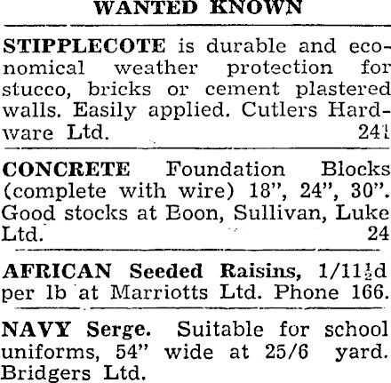 WANTED KNOWN STIPPLECOTE is durable and economical weather protection for stucco, bricks or cement plastered walls. Easily applied. Cutlers Hardware Ltd. 241 CONCRETE Foundation Blocks (complete with wire) 18”, 24”, 30”. Good stocks at Boon, Sullivan, Luke Ltd. 24 AFRICAN Seeded Raisins, 1/1 ltd per lb at Marriotts Ltd. Phone 166. NAVY Serge. Suitable for school uniforms, 54” wide at 25/6 yard. Bridgers Ltd.