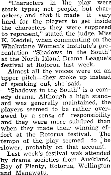 “Characters in the play were stock types; not people, but characters, and that it made it very hard for the players to get inside the characters they were supposed to represent,” stated the judge, Miss K. Keddel, when commenting on the Whakatane Women’s Institute’s presentation “Shadows in the South” at the North Island Drama League’s festival at Rotorua last week. Almost all the voices were on an upper pitch—they spoke up instead of speaking out, she said. ~ '.‘Shadows in the South” is a comedy drama. Although a high standard was generally maintained, the players seemed to be rather overawed by a sense of responsibility and they were more subdued than when they made their winning effort at the Rotorua festival. The tempo of the play seemed to .be slower, probably on that account. Last week’s festival wa's attended by drama societies from Auckland, Bay of Plenty, Rotorua, Wellington and Manawatu.
