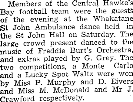 Members of the Central Hawke’s Bay football team were the guests of the evening at the Whakatane St John Ambulance dance held in the St John Hall on Saturday. The large crowd present danced to the music of Freddie Burt’s Orchestra, and extras played by G. Grey. The two competitions, a Monte Carlo and a Lucky Spot Waltz were won by Miss P. Murphy and D. Eivers and Miss M. McDonald and Mr J. Crawford respectively.