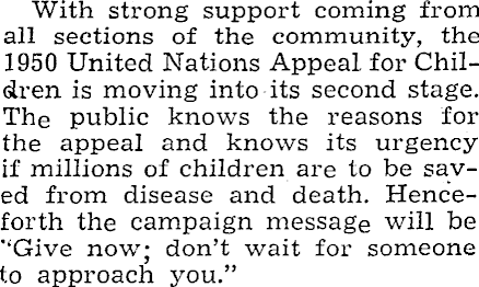 With strong support coming from all sections of the community, the 1950 United Nations Appeal for Children is moving into its second stage. The public knows the reasons for the appeal and knows its urgency if millions of children are to be saved from disease and death. Henceforth the campaign message will be ‘‘Give now; don’t wait for someone to approach you.”