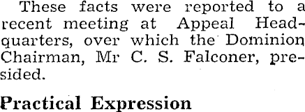 These facts were reported to a recent meeting at Appeal Headquarters, over which the Dominion Chairman, Mr C. S. Falconer, presided. Practical Expression