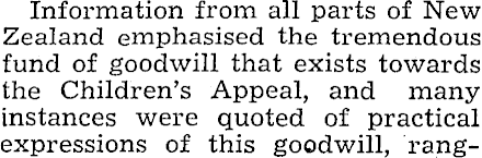 Information from all parts of New Zealand emphasised the tremendous fund of goodwill that exists towards the Children’s Appeal, and many instances were quoted of practical expressions of this goodwill, rang-