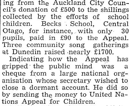 ing from the Auckland City Council’s donation of £SOO to the shillings collected by the efforts of school children. Becks . School, Central Otago, for instance, with only 30 pupils, paid in £9O to the Appeal. Three community song gatherings at Dunedin raised -nearly £I7OO. Indicating how the Appeal has gripped the public mind was a cheque from a large national organisation whose secretary wished to close a dormant account. He did so by sending the money to United Nations Appeal for Children.