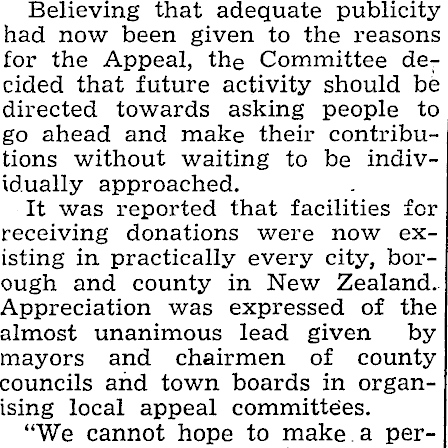 Believing that adequate publicity had now been given to the reasons for the Appeal, the Committee decided that future activity should be directed towards asking people to go ahead and make their contributions without waiting to be individually approached. It was reported that facilities for receiving donations were now existing in practically every city, borough and county in New Zealand. Appreciation was expressed of the almost unanimous lead given by mayors and chairmen of county councils and town boards in organising local appeal committees. “We cannot hope to make a per-