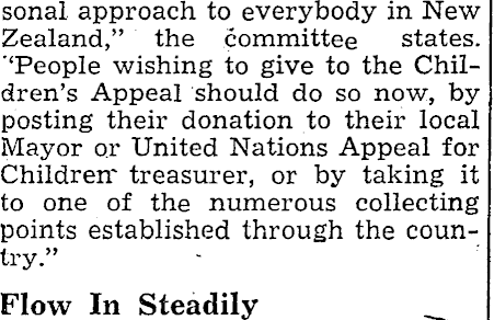 sonal approach to everybody in New Zealand,” the committee states. ‘People wishing to give to the Children’s Appeal should do so now, by posting their donation to their local Mayor or United Nations Appeal for Children' treasurer, or by taking it to one of the numerous collecting points established through the country.” Flow In Steadily _
