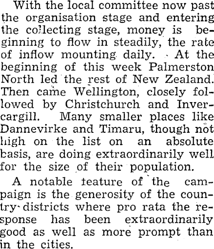 With the local committee now past the organisation stage and entering the collecting stage, money is beginning to flow in steadily, the rate of inflow mounting daily. At the beginning of this week Palmerston North led the rest of New Zealand. Then came Wellington, closely followed by Christchurch and Invercargill. Many smaller places like Dannevirke and Timaru, though not high on the list on an absolute basis, are doing extraordinarily well for the size of their population. A notable feature of the campaign is the generosity of the country districts where pro rata the response has been extraordinarily good as well as more prompt than in the cities.