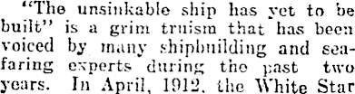 "The unsinkable ship has yet to be built" is a grim truism that has been voiced by many shipbuilding and seafaring experts during tho past two years. In April, 1912, the White Star