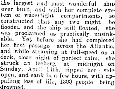 the largest and most wonderful ship ever built, and with her complete system of watertight compartments, "so constructed that any two might be flooded and the ship still floated, she was proclaimed as practically, unsinkable. Yet before she had completed her first passage across the Atlantic, and while steaming at full-speed on a dark, clear night of perfect calm, sbo struck an iceberg at midnight on Sunday, April 14th. ripped her j sid.* open, and sank in a few hours, with appalling loss of life, 1300 people being drowned.