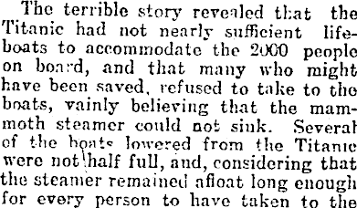 terrible story revealed that the Titanic had not nearly sufficient lifeboats to accommodate the 2000 people on board, and that many who might have been saved, refused to take to tho boats, vainly believing that the mammoth steamer could not sink. Several of the hcmto lowered from the Titanic were notlhalf full, and, considering that the steamer remained afloat long enough for every person to have taken to the