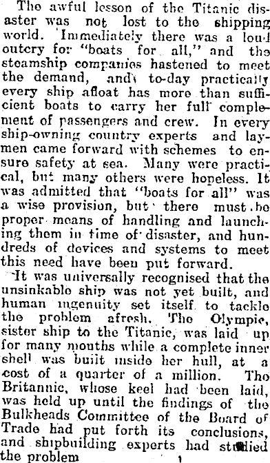 Tho awful lesson of tho Titanic disaster was not lost to the shipping world. Immediately there was a loud outcry for "boats "for all," and the steamship companies hastened to meet the demand, and* to-day practicaitj every ship afloat has more than sufficient boats to carry her full" complement of passengers and crew. In every ship-owning country experts and laymen came forward with schemes to ensure safety at sea. Many were practical, but m3ny others were hopeless. It was admitted that "boat- for all" was a wise provision, but 1 there must.ho proper means of handling and launching them in time of' disaster, and hundreds of devices and systems to meet this need have been put forward. Tt was universally recognised that the unsinkablo ship was not yet built, and human ingenuity set itself to tacklo the problem afresh. Tho Olympic, sister ship to the Titanic, was laid up for many mouths while a complete inner shell was buiit inside her hull, at a •cost of a quarter of a million. Tho Britannic, whose keel had been laid, was held up until the findings of the Bulkheads Committee of the Board of Trade had put forth its conclusions, and shipbuilding experts had stdWied the problem i