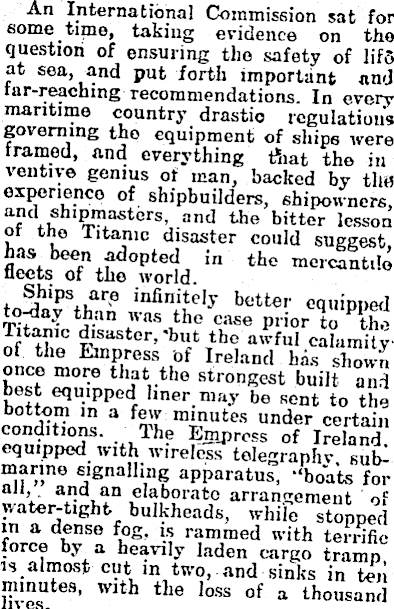 An International Commission sat for some time, taking evidence on the question of ensuring the safety of lifs at sea, and put forth important and tar-reaching recommendations. In every maritime country drastic regulations governing the equipment of ships were framed, and everything t*nat the in ventiye genius of man, backed by the" experience of shipbuilders, shipowners, o "*' and tbe b '«er lesson of the Titanic disaster could suggest. Titanic disaster,'but the awful calamityof the Empress of Ireland has shown once more that the strongest built and best equipped liner may be sent to the bottom in a few minutes under certain conditions. The Empress of Ireland equipped with wireless telegraphy subl marine signaling apparatus, "boats for an,. and an elaborate arrangement of water-tight bulkheads, whife stopped ni a dense fog, is rammed with terrific force heavily laden cargo tramn is.almost cut in two,.and sinks in ten minutes, with the loss of a thousan
