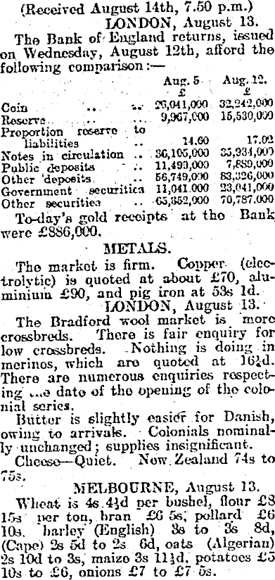 (Received August 14th, 7.50 p.m.) LONDON, August 13. The Bank of' England returns, issued on Wednesday, August 12th, afford the following comparison:— ■■•'■.' Anff.s Aug. 10. ■ ■■■■..- •■'•-■ ■ £ , ■ £ Cain ■' .■' '.•• 2C.041.000 32,242,000 Koservs., ... ... r 15,530,000 Proportion reserve to liabilities ■ - 17.02 Not«s in circulation .. .30,100,000 55.931.000 Public dopoeite - .. 11,4W,000 Other 'depoeita •• 86,749,090-83.326,000 Government securitica 11,041.000 23,041,000 Other securities ~ 65,862,000 70,787.000 To-day's gold receipts' at tho Bank, were £880,000. -. , BIETALS. The market is firm. Copper- (eloctrolvtic) is quoted at about £70, aluminium £90, and pig iron at 53s Id. IX)NDON, August 13. The Bradford -wool market is more crossbreds. There is fair enquiry for low croesbrede. . Nothing is doing in merinos, which are quoted at 16Jd. There are numerous enquiries respecting 1..10 date of the owning of the colonial series. . Butter is elightly easier for Dcimsh, owiiisi to arrivals. Colonisils nominally unchanged j eupplies insignificant. Cheese—Quiet. Now. Zealand 74s to MELBOURNE, August, 13. Wheat is 4s.4id per bushel, flour £8 15a jicr ton, bran £G ss; pollard £6 10a. barley (English) Sβ to 3s Bd, (Cape) 2s o<l to 2s 6d, oats (Algerian) 2s lOd to 3s, maisso 3s Hid. potatoes £0 10s to £6, onions £7 to £7 os.