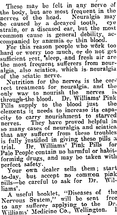 These may be felt in any nervo of tho body, but arc most frequent in the nerves of tho licad. Neuralgia may be caused by a deeayed tooth, eye strain, or a diseased ear, but the most common cause is general debility, accompanied by anosmia or thin blood. For this reason people who \v6rk too hard or worry too much, or do not get sufficient rest, 'sleep,-and fresh air are the most frequent sufferers from neuralgia, also sciatica, which is- neuralgia of tlie sciatic nerve. Nutrition for tho nerves is the coriect treatment for neuralgia, and the only way to nourish tho nerves is through-thc blood. Dr. Williams' Pink Pills supply to tho blood just tlio elements it needs to increase its capacity to carry nourishment to starved nerves. They have proved helpful in so many cases of neuralgia and sciatica that anv sufferer from those troubles is fully 'justified in giving these pills a trial. Dr. Williams' Pink Pills for Pale People contain no harmful or habitformiiig drugs, and may bo taken with perfect safety. Your own dealer sells them; stai t to-dav. but accept no common pink pills—be careful to ask for Dr. A\il''Tnseful booklet, "Diseases of tho Nervous System," will bo sent free to anv sufferer applying to .the ui. Williams' Medicine Co., Wellington. 1