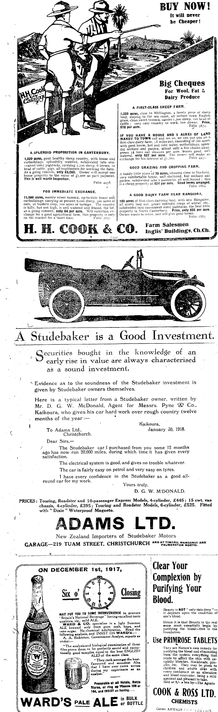 )|j ' hot coH I did orchard and garden, school only a few chains away, B A SPLEKDID PROPOSITION IN CANTERBURY. grows 3i tons oat sheaves per acre, fences goo.! \?e. N watered, only £27 per acre. The owner will make an B 1,000 acres, good healthy sheep country, with house and exchange for bis interest of £1 ,roo. Folio 4451. g outbuildings, splendidly watered, subdivided into con- 2g venient sized paddocks, carrying 1.100 sheep. 6 horses, 10 t*nnn r>bating Arm CROPPING FARM n head of cattle, pigs, all implements for working the farm. SOOD GRAZING AND CROPPING | 3 As a going concern, only £S,OOO. Owner will accept one . handv little place of 70 acres, situated close to Sheffield. I house property to the value of £1,000 as part payment. * comfortable liobss, well sheltered, fine orchard and ■ ThJs is wen worth lnspeci«on. Sn Subdivided into 7 oaddocks. all welt.fenced ; th« I Folio 4438. f chcap propcrtv at £24 per acre. Good terms arranged. | , , 1-oho 2864- ■ FOR IMMEDIATE EXCHANGE. „ I A GOOD DAIRY FARM NEAR RANGIORA. B 11.000 acres, mostly silver tussock, up-to-date house and , I outbuildings, carrying at present 6,000 sheep. 100 acres of 100 acres of first-class dairying land, with new Bungalow, ■ oats, 50 bushels crop, 100 acres of turnips. The country all nicely laid out, grows splendid crops rffi ' B is hilly, but not high, is well watered and fenced, the lot, subdivided into convenient sized paddocks, the best 11 e m as a going concern, only £4 per acre. Will entertain ex- property in North Canterbury. Price, only £55 per acre, n change for a good agricultural farm, this property is only Owner wants to retire, and will g'-ve good terms. B on the market for a short time. Folio* 3677. rolio 200,. g Hlf &£ £> Farm Salesmen | • JOL Ck Inglis' Buildings, Ch.Ch.^ A Studebaker is a Good Investment. Securities bought in the knowledge of an early rise in value are always characterised as a sound investment. v Evidence as to the soundness of the Studebaker investment is given by Studebaker owners themselves. Here is a typical letter from a Studebaker owner, written by Mr. D. G. W. McDonald, Agent for Messrs. Pyne & Co., Kaikoura, who gives his car hard work over rough country twelve . months of the year:— j ' Kaikoura, ' To Adams Ltd., January 30, 1918. v. Christchurch. Dear Sirs, — ' / The Studebaker car 1 purchased/ from you some 12 months ago hae now run 20,000 miles, during which time it has given every satisfaction. The electrical system is good, and gives no trouble whatever, The car is fairly easy on petrol and very easy on tyres. I have every confidence in the Studebaker as a good allround car for my work. Yours truly, D. G. W. M'DONALD. PRICES: Touring, Roadster and 10-passenger Express Models, 4-cylinder, £445; 15 cwt. van chassis, 4-cylinder, £395; Touring and Roadster Models, 6-cylinder, £525, Fitted with " Dixie " Waterproof Magneto. ADAMS LTD. New Zealand Importers of Studebaker Motors GARAGE—2I9 TUAM STREET, CHRISTCHURCH '"''V.IKI.WSgiSa! »» - \ I t ON DECEMBER Ist, 1917, \ ,Clear IOUr I Complexion by !j| | j S ingYonr I KyV/l®.. . '■ • Beauty is NOT " only skin deep " —, MsmWk MAY PUT YOU TO SOME (NCONVENIENCC to procure || it depends upon the condition of $ '"Britain's National Beverage" having excellent tonic one's blood. i ''wARDft CO. specialise in a light Summer Hence it is that Beauty in the real J ALE brewed only from pure malt. hops, and sense mnst essentially beffm by 4 Kfl G33J* b '" " lto wMlll , Use PRIMROSE TABLETS —The analysis and biological examination of these \ Ales prove them to be perfectly sound ««P; They axe own remedy for tionaUy good samples, equal to the best ENGLISH purifying the Wood and elumnatmg ■f* ALES of the same class. from the system everything that "They rank amongst the best- tends to affict the skin mth unBl* aSTgIB , flavoured and soundest Ales s.ghtly blotches, blackheads, pirnJsfi| j|f&- that 1 have ever come across P-® s - etc - m . a >* be given to mm) dUri " B CXperienC# " wryTonto-f MaaJto ■BKil PrMlirtbl*all Hotsls, Btttl* sSTat 1/-a Hhl VaSsfn?storM. or rtni up 'Won** ls ' COOK & ROSS LTD. WARD'S PALE ALE or bottle CHEMISTS V ' ' : J Corner ARMAIrH > • >,; jj j S