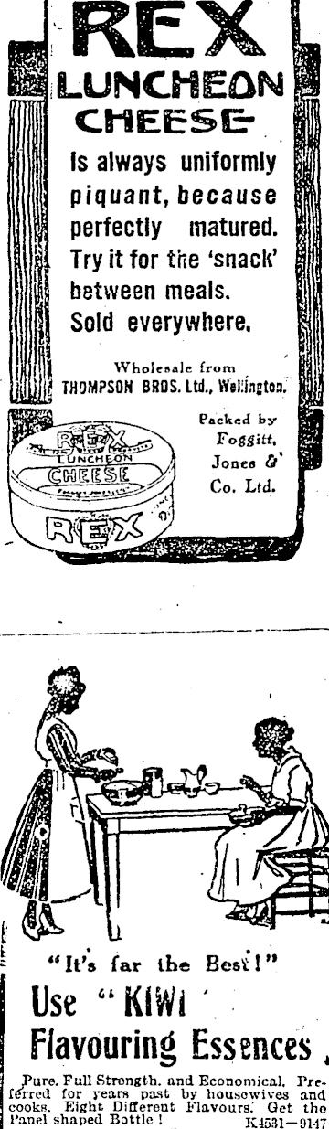 J REX L iLUNCHEON | II CHEESE". j is always uniformly 1 piquant, because |i I perfectly matured. | I Try it for the'snack' | between meals. | Sold everywhere. | [I I Wholesale from 1 |1| THOMPSON BROS. Ltd., Weliingtoa. | Joaee 9 ' "It's far the Be»i 1" | Use "KIWI Flavouring Essences, | Pure. Full Strength, and Economical. Pre- | lerred for years past by housowives and | cooks. Eight. Different Flavours.' Get tho I I'anel shaped Bottle ! K4531—9117
