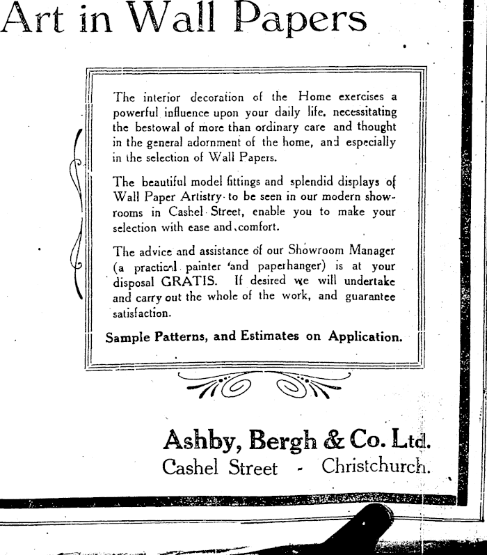 Art in Wall Papers s The interior decoration of the Home exercises a fl . powerful influence upon your daily life, necessitating I m the bestowal of more than ordinary care and thought fl J in the general adornment of the home, and especially H in the selection of Wall Papers. H \\ The beautiful model fittings and splendid displays of B 1 Wall Paper Artistry -to be seen in our modern show- fl rooms in Cashel Street, enable you to make your fl J selection with ease and,comfort. fl // The advice and assistance of our Showroom Manager fl y (a practical painter 'and paperhanger) is at your 8 I disposal GRATIS. If desired \*e will undertake fl * and carry out the whole of the work, and guarantee Ig satisfaction. fl Sample Patterns, and Estimates on Application. fl | Ashby, Bergh & Go. Ltd. I Cashel Street - ChristchurcL _ I