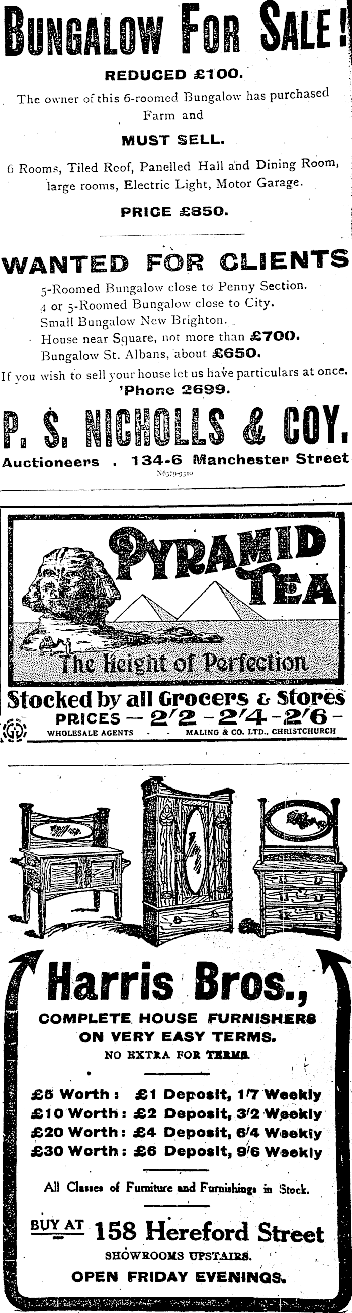 Bungalow For Sale !| REDUCED £TOO. The owner of this 6-roomed Bungalow has purchased , Farm and MUST SELL. 6 Rooms, Tiled Roof, Panelled Hall and Dining Room, j large rooms, Electric Light, Motor Garage. j PRICE £350. j WANTED FOR CLIENTS 5-Roomed Bungalow close to Penny Section. 4 or 5-Roomed Bungalow close to City. Small Bungalow New Brighton. .. • House near Square, not more than £700. Bungalow St. Albans, about £650. If you wish to sell your house let us have particulars at once. 'Phone 2699. P. S. MOLLS & COY. Auctioneers . 134-6 Manchester Street Stocked by all Grocers o stores prices — - St f 4--2fG - J)/ WHOLESALE AGENTS - MALING & CO. LTD., CHIUSTCHURCH Bros., 3 COMPLETE HOUSE FURNISHERS I I ON VERY EASY TERMS. I H NO BXTX.A FOR TBIMA. I I £5 Worth : £1 Deposit, iT Woekly 1 B £10 Worth: £2 Deposit, 3'2 Wja*kly B | £20 Worth: £4 Deposit, 6'4 Weekly B 1 £30 Worth: £6 Deposit, Weekly B ■ All Classes of Furniture and Furnishings in Stock. '.B | B "L AT 158 Hereford Street 1 B SHOWROOMS UPSTAIRS. B B OPEN FRIDAY EVENINGS* B