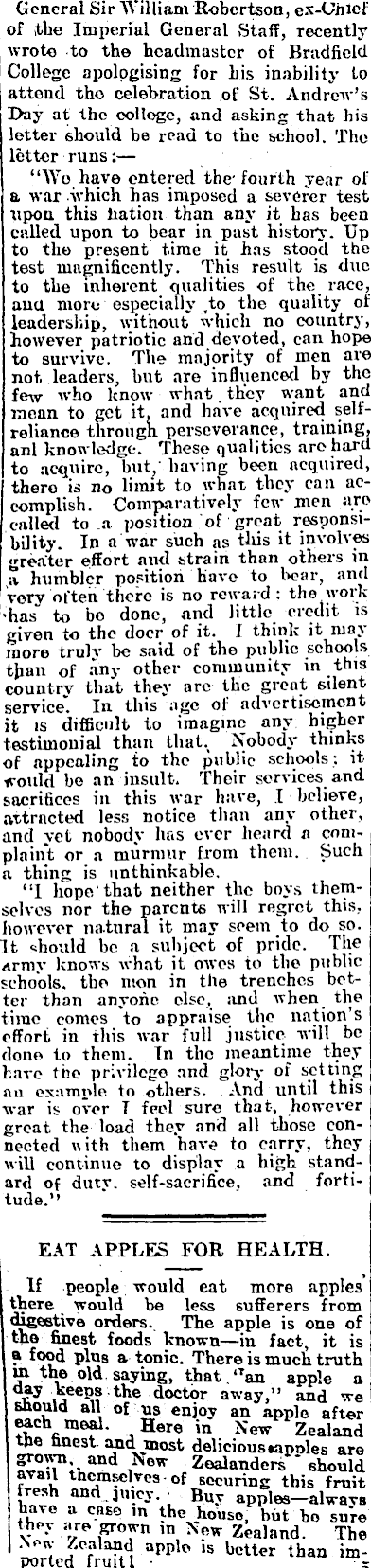 General Sir William Robertson, ex-Uhlef of the Imperial General Staff, recently wrote to the headmaster of Bradfield College apologising for his inability to attend tho celebration of St. Andrew's 3>ay at the college, and asking that his letter should be read to the school. Tho letter runs:— "Wo have entered the - fourth year of a war which has imposed a severer test upon this liation than any it has been called upon to bear in past history. Up to the present time it has stood the test magnificently. This result is due to the inherent qualities of the race, ana more especially t to the quality of leadership, without which no country, however patriotic and devoted, can hope to survive. The majority of men are not. leaders, but are influenced by the few who know what they want and mean to get it, and have acquired selfreliance through, perseverance, training, anl knowledge. These qualities are hard to acquire, but,' having been acquired, there is no limit to what they can accomplish. Comparatively few men are called to a position of great responsibility. In a war such as this it involves greater effort and strain than others in a humbler position have to bear, and very often there is no reward: the work •has to bo done, and little credit is given to the doer of it. I think it may more trulv be said of the public schools tfcan of any other community in this country that they are the great silent service*. In this age of advertisement it is difficult to imagine any higher testimonial than that. Nobody thinks of appealing to the public schools: it trould be an insult. Their services and sacrifices in this war have, I • believe, attracted less notice than any other, and yet nobody has ever heard a complaint or a murmur from them. Such a thing is unthinkable. "1 hope' that neither the boys themselves nor the parents will regret this, however natural it may seem to do so. It should be a subject of pride. The Army knows what it owes to the public schools, the nion in the trenches better than anyone else, and when the time comes to appraise the nation's effort in this war full justice will be done to them. In the meantime they have the privilege and glory of setting an example to others. An 3 until this ■war is over I feel sure that, however great the load they and all those connected with them have to carry, they will continue to display a high standard of duty, self-sacrifice, and fortitude.'' EAT APPLES FOR HEALTH. If people "would eat more apples' there _ would be less sufferers from digestive orders.. The apple is one of tho finest foods known—in fact, it is a food pins a tonic. There is much truth m the old, saying, that. ,T an apple a ,* ec P® the doctor away," and we should all of us enjoy an apple after each meal. Here in New Zealand the finest Mid most delicioustapples are M n ii, an i w Zealanders * should avail themselves of securing this fruit fresh and juicy. • Buy apples—alwavs have a case in the houso, but bo sure they are grown in New Zealand. The < V c ? -,1 a PP Ip ,s better than imported fruit I • r