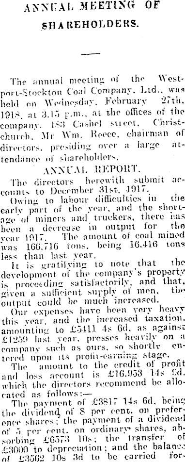 ANNUAL MEETING OF shareholders. The annual meeting ot the NN est-pon-Stockton Coal Company. Ltd.. was held Oil Wednesday. February 27th, ]91*5 ;ll 3.|.*, p.m., at the offices of the company. I>3 C'ashel sucet. Christchurch. Mr NVm. Beece. chairman ot directors, presiding over a huge attendance of shareholders. ANNUAL REPORT. The directors herewith submit accounts to December 31st. 1917. Owing to labour difficulties in the earlv part of the year, and the shortage of miners and truckers, there has been a decrease in output for the vear 1017. The amount of coal mined was 160.716 tons, being 16.416 von? less than last year. It is gratifying to note that '.he development oi the company s property is procc'tdine satisfactorily, and that, given a sufficient supply of men. tue output could be much increased. Our expenses have been very heavy this vear. and the increased taxation, amounting to -Colli 4s 6d, as againsu iJl'Jo!' last year, presses heavily on a. company such as ours, so shortly entered upon its profit-earning stage. The amount to the credit ol profit and loss account is £16.9-33 Ms ./d. which the directors recommend be allocated as follows:— Tin* pavnient of £'381 > 14s 6d, being the dividend of 8 per cent, on preference shares: the payment of a dividend of *i per cent, on ordinary shares, absorbing .£6-373 10s; the transfer of r "3OW to depreciation; and the balanoo of £3-362 ]0s 3d to be carried ror-