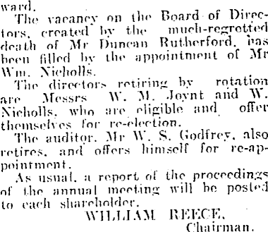 " "rlie vacancy on the Board of Directors created by the liiuch-regrottod death of Mr Duncan Rutherford nas been tilled by the appointment of Mr Win. Nieholls. The directors retiring by rotation are Messrs W. M. -Joynt and AN. Nieholls. who are eligible and offer themselves for re-election. The auditor. Mr W. S. Godfrey, also retires, and offers himself for re-ap-pointment. As usual, a report of the proceedings of the annual meeting will be posted to each shareholder. WILLIAM JvKKCL. Chairman.