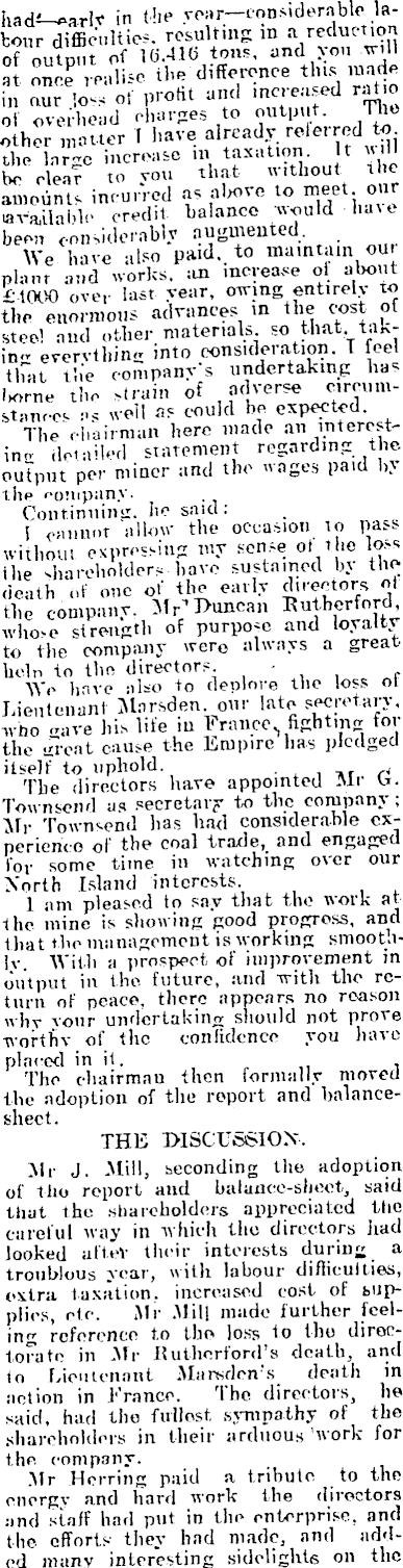 in the year—considerable labour difficulties, resulting in a reduction of output of 10.4.10 tons, and you will at once realise the difference tins made in our !o- of proht and mc' ca. Ed rat o of overhead charges to output. The other in otter 1 have already, referred to. the large increase m taxation. It will be clear to vou that without the amounts incurred as above to meet our available credit balance -w-ould lu\e been considerably augmented. . NVe have also paid., to maintain ou. plant and works. :ui increase oi about £-1000 over last year, owing entirely to the enormous advances in the cost of steel and other materials, so that, taking everything into consideration, I feel that the company s undertaking has l>orne the strain of adverse stnnces i's well as could be expected. The cl.airman here made an interesting detailed statement regarding the. output per miner and the wages paid by the company. Continuing. he said : i cannot allow the occasion lo pass without expressing my sense ot the loss the shareholders have sustained by the; death of one of the early directors ot the company. Mr" T>uncan Rutherford, who*e strength of purpose and loyalty to the company were always a great, hcln to the directors - NVe have also to deplore the loss ot Lieutenant Mnrsden our late secretary, who crave his life m France, fighting for the great cause the Empire has pledged itself to uphold. . . The directors have appointed Mr V?. Town send as secretary to the company; Mr Townsend has, had considerable experience of the coal trade, and engaged for some time in watching over our North Island interests. 1 am pleased to say that the work at the mine is showing good progress, and that tho management is working smoot.iIv AYith a prospect of improvement in output in the. future, and with tho return of peace, there appears no reason whv voiir undertaking should not prove worthv of the confidence you have placed in it. The chairman then formally moved the adoption of the report and balancesheet. THE DISCUSSION, Mr J. Mill, seconding the adoption of tho report and balance-sheet, said that the shareholders appreciated the careful way in which the directors iiad looked afteV their interests during a troublous year, with laboux - difficulties, extra taxation, increased cost of t>upplies, etc. Mr Mill made further feeling reference to tho loss to the directorate in Mr .Rutherford's death, and to Lieutenant Marsdens death in action in France. The directors, he said, had the fullest, sympathy of the shareholders in their arduous "work for the. company. Mr Herring paid a tribute to the energv and hard work the directors and staff had put in the enterprise, and the efforts they had made, and added many interesting sidelights on the