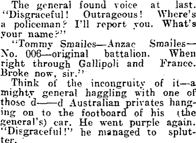 The general found voice at last. "Disgraceful! Outrageous! Where's a policeman? I'll report you. What's your name?" "Tommy Smailes—Anzac Smailes — No. battalion. When right through Gallipoli and France. Broke now, sir." Think of the incongruity of it—a mighty general haggling with one of those d— —d Australian privates hanging on to the footboard of his (.the general's) car. He went purple again. "Disgraceful!'' he managed to splutter. '