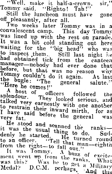 "Well, make it half-a-crown, sir," Tommy said. "Righto! Tah!" Still the luncheon must have gone off pleasantly, after all. Two weeks later Tommy was in a convalescent camp. This day Tommy was lined up with the rest on parade. It was a bit cold standing out here waiting for the "big head" who was to inspect .them.. Still last night i:e nad obtained tick from the canteen manager—nobody had ever done that T ° re - that was no reason wiiv iommy couldn't do it again. At last '<H k D £ ,e: "The general salute." comes!" splendour ° f J oUo * ed talked Jhe .Y looked serious, and to restrain tlf 0 r - nye ® y with one anot^er i i.vT Sd tb & r 7 a t !; d »» very fat. the general was TsL^T 6 the , ranks ~ denly he started. jrj, °\ ® Uf '" to an officer. "Tell lrncd r .°' JD<] from the right—to fall out"'?" - °' S It was Tommy. u . nient went Tip from tI )P rl* , was this? ho £ J* Mcdall- D.C.M. perhaps V , l,s t ry 1 °\ And this