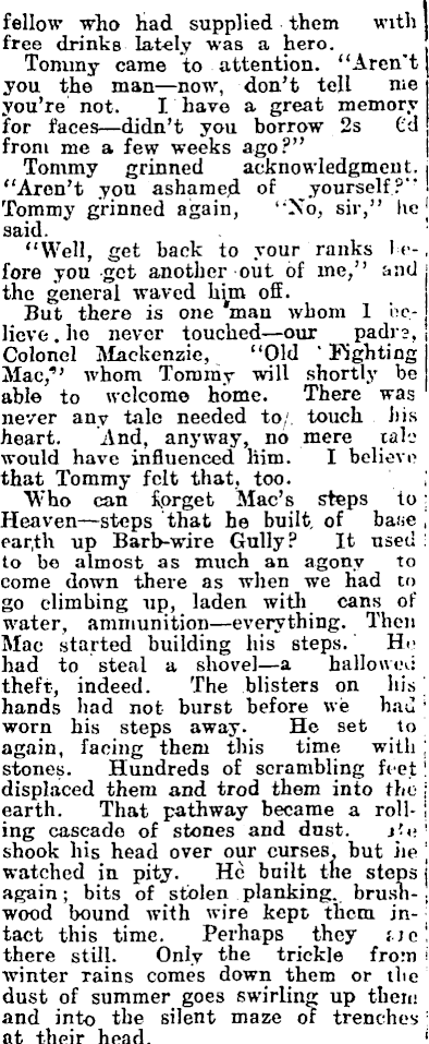 fellow who Had supplied them with I free drinks lately was a hero. Tommy came to attention. "Aren't | you the man—now, don't tell me t you're not. I have a great memory for faces—didn't you borrow 2s t'd front me a few weeks ago?" | Tommy grinned acknowledgment, j "Aren't you ashamed of yourself ? v ' Tommy grinned again, "No, sir," tie J said. 1 "Well, get back to your ranks I c-, fore you get another out of me," and j the general waved him off. But there is one man whom 1 believe, ho never touched—our padrj, , Colonel Mackenzie, "Old 'lighting Mac,"" whom Tommy will shortly be able to wclcomo home. There was never any tale needed to/, touch his heart. And, anyway, no mere tale would have influenced him. I believe that Tommy felt that, too. ; Who can ilprget Mac's steps to; Heaven —steps that he built, of bafse , ear.th up Barb-wire Gully? It used : to be almost as much an agony to come down there as when we had to go climbing up, laden with cans of water, ammunition—everything. Then Mac started building his steps. Ho had to steal a shovel—a halloweii theft, indeed. The blisters on his' hands had not burst before we hau ' worn his steps away. He set to again, facing them this time with; stones. Hundreds of scrambling feet! displaced them and trod them into the j earth. That pathway became a roll- i ing cascade of stones and dust. jt a ■ shook his head over our curses, but iie | watched in pity. He built tile steps j again; bits of stolen planking, brush-. wood bound with wire kept them jn- j tact this time. Perhaps they sjc! there still. Only the trickle from i winter rains comes down them or the dust of summer goes swirling up them and into the silent maze or trenches; at their head. '