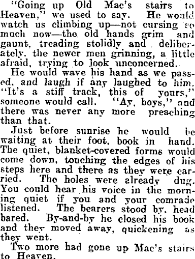 "Going up Old Mac's stairs to Heaven," we used to say. He would watch us climbing up—not cursing tc> much now—the old hands grim and gaunt, treading stolidly and deliberately. the newer men grinning, a little afraid, trying to look unconcerned. He would wave his hand as we passed, and laugh if any laughed to him. "It's a stiff track, this of yours," someone would call. "Ay, boys," and there was never any more preaching than that. Just before sunrise he would be waiting at their foot, book in hand. The quiet, blanket-covered forms would come down, touching the edges of his steps here and there as they were carried. The holes were already dug. You could hear his voice in the morning quiet if you and your comrade listened. The bearers stood by. head bared. By-and-by he closed his book and they moved away, quickening &.s they went. Two more had gone up Mac's stairs to Heaven.