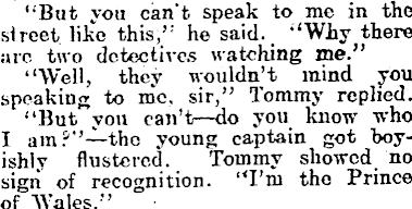 "But you can't speak to me in the slreet like this,' 1 he said. "'Why there arc two detectives watching me." "Well, they wouldn't mind you speaking to me, sir," Tommy replied. "But yon can't —do you know who I am?"—tho young captain got boyishly flustered. Tommy showed no sign of recognition. ''I'm the Prince of Wales."