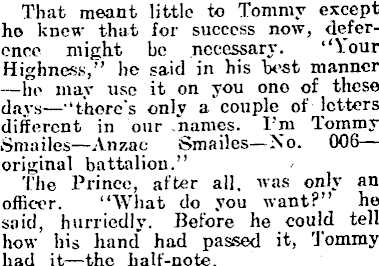 That meant little to Tommy except ho knew that for success now, deference might be nccessary. ''Your Highness," he said in his best manner —ho may use it on you ono of these days—''there's only a couple of letters different in our .names. I'm Tommy Smailes —Anzac Smailes—No. 006— original battalion." Tlie Prince, after all, was only an officer. "What do you want?" he said, hurriedly. Before he could tell how his hand" had passed it, Tommy had it—the half-note.