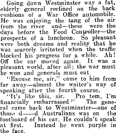 Going down Westminster way a fat, elderly general reclined on the back cushions of a War Office automobile. He was enjoying the tang of the air from the river and—these were the days before the Food ConJ<roller —the prospects of a luncheon. So pleasant were both dreams and reality that he was scarcely irritated when the traffic blocked his progress for a while. Ah! Off the car moved again. It was a pleasant world, after all; the war must be won and generals must eat. "Excuse me, sir," came to him from far away—almost the waiter's way of speaking after the fourth course. "It's like this, sir. Pro tem, I'm financially embarrassed." The general came" back to Westminster—one of those d——d Australians was on the footboard of his car. He couldn't speak at first. Instead he went purple in the face.
