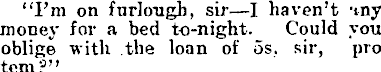 "I'm on furlough, sir—l haven't -my money for a bed to-night. Could you oblige with the loan of ss, sir, pro tem?"