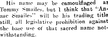 His name may be camoulflaged as Tommy Smailes. but 1 think that '"Anzac Smailes" will be his trading title still, all legislative prohibition against the base use of that sacred name notwitiistar.ding.