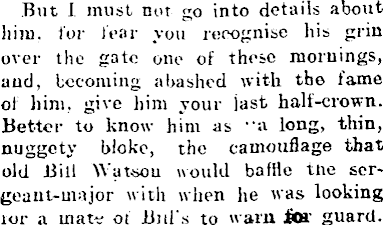 Bnt I must not go into details about him. for tear you recognise his grin over the gate one of these mornings, and, becoming abashed with the fame of him. give him your jast half-crown. Bettor to know him as - 'a long, thin, nuggety bloke, the camouflage that old Bill Watson would baffle tne ser-geant-major with when he was looking lor a inatv ot Bid's to warn for guard.