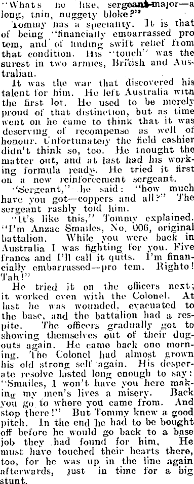 "W'hats ne like, sergeaaMnajor —a long, tnin, nuggety bloke?" lomuiy lias a speciality. It is that of being "financially enioarrassed pro torn, and of linding swift reflet iiom that condition. His ••touch'' was the surest in two armies, British and Australian. It was the Avar that discovered his talent for him. He left Australia with the lirst. lot. Ho used to be merely proud of that distinction, but as time went on he i-aine to think that it was deserving of recompense as well of honour. Onfortunateiy the field cashier didn't think so, too. He tnought the matter out, and at last had his working formula ready-. He tried it first on a new reinforcement sergeant. •'Sergeant/' he said: "how much have you got —coppers and all:''' 'J'he sergeant rashly told him. "It's like this," Tommy explained. "I'm Anzac Smailcs, No. 006, original battalion. While you were back in Australia 1 was fighting for you. Five l'ranos and I'll call it quits. I'm financially embarrassed—pro tem. Bighto! Tali!" He tried it on the officers next; it worked even with the Colonel. At last he was wounded, evacuated to the base, and the battalion had a respite. Tho officers gradually got to showing themselves out of their dugouts again. He camo back ono morning. Tho Colonel had almost grown his old strong self again. His despcrato resolve lasted long enough to say: '"Smailcs, I won't have you here making my men's lives a misery. Back you go to where yotl came from. And stop there!" But Tommy knew a good pitch. In the end lie had to be bought off before he would go back to a base job they had found for him. He must have touched their hearts there, too, for he was up in the line again afterwards, just in time for a big stunt.