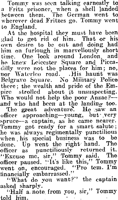 Tommy was scon talking earnestly to a Fritz prisoner, -when a shell landed .between them. The German went to wherever dead Fritzcs go. Tommy went U) England. At the hospital they must have been j<lad to get rid of him. That or his own desire to be out and doing had him on furlough in marvellously short time. One look around London, and he kne-.v Leicester Square and Piccadilly were not the places for him; no, nor "Waterloo road. .His haunt was Belgiaro Square. No Military Police there; the wealth and pride of the. Empire strolled about it unsuspecting. Who would not help the poor Anzac?— and who had been at the landing too. The great adventure! Ho .saw an officer approaching—young, but'.very spruce—a captain, as he came nearer. Tommy got ready for a smart salute; he ivas always regimentally punctilious ■when. his special business was to be done. Up went tho right 1 hand. The officer as punctiliously returned it. "Excuse me, sir," Tommy said. The officer paused. "It's like this," Tommy went on, encouraged. "Pro torn. I'm financially embarrassed." "What do you want?" the captain asked sharply. "Half a.note from you, sir/' Tommy told him. •
