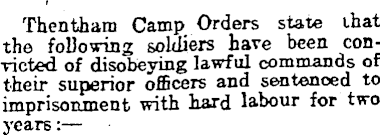 Thentham Camp Orders state that the following soldiers have been convicted. of disobeying lawful commands of their superior officers and sentenced to imprisonment with hard labour for two years:—