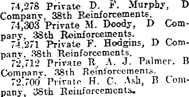 74,278 Private T>. F. Murphy, D Companv, 38th Reinforcements. 74,303 Private M. Doody, D Companv. 38th Reinforcements. 74,271 Private F. Hoagins, D Companv. 38th Reinforcements. 72,712 Private R. A. J. Palmer. B Companv. 38th Reinforcements. 72.700 Private H. C. Ash, B Company, dsth Reinforcements.
