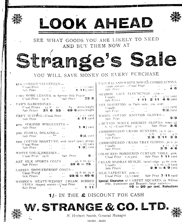 I * LOOK AHEAP * 1 s . SEE WHAT GOODS YOU ARE LIKELY TO NEED H AND BUY THEM NOW AT f Strange's Sale YOU WILL SAVE MONEY ON EVERY PURCHASE 27't) ' ORDED VELVETEEN' — NATURAL A NT) HITE WO\ EN COMBINATION'S. 1 "Mial Pricc - 'i i van! ,>bort Serves. -I W Price ' Sale Pncc .. .. 1 11! van! -Sale Prior- . . \r>o\V L\CE IvLOUXC-IXGS. 2;in. — j only ROBE LENGTH, in ApHcot Silk Poplin , , lv -6 ;,k ./,, var.l ! Usual Pricc 39/6 Sale Pricc 33 6 salcV/iccs 1112 11 4/6 yard ' FAV*N GABERDINES- - NET INSERTION, in Pari:- only, ;in. -wide----Usual Prices ?2/6 »»; S4 - drosslcnßlh |'suallv •• • yard Sale Prices 31, 6 55. - 69'6 dress length Sa'ft JVicr- •• •• 9 Id. yard !GREV SUITING—UsuaI Price .. ; n yard WHITE COTTON KNITTED GLOVES— Sale Pricc .. .. 4-11 yard Sale I 1: ice • • 2/3 4 oin.' STRIPED WTKCEVETTE- 2-BUTTOX WHITE DOESKIX CLOVES sizes £ SaU- Pricc .. .. 14.} van! <>{-Uual Pncc 4 'ii Sale Price 3/6 ' 3 ohi. FLORAL DELAINE— EMBROIDERED CRASH RUNNERS, ,4 x 54- .. :: "i'/l A/ii 3/3 soin. COTTON SHANTUNG, with srra'l lancydcsign ~M BRO[ DERED CRASH TRAY CLOTHS, xV> Usual Price .. .. 1 6J yard ... OQ Sale Pricc .. .. 1 /3i yard Sale Pnccs 3/9 4 6 WHITE VOILES DRESSES— rOl OURED BORDERED CURTATN VOILE, 40m. Usual Pr'ce 29/6 Sale Price 5 - l/pual Pricc 2,.'6 yard Sale Price I'l 1 yard ART SILK SPORTS COATS 40 6 to 95/- rRI . :AM MADRAS MUSLIN, tassel edge, 45 to join. | Sale Priccs .. .. 39/6 to 75. - Usually .. .. •• .3/6 to 5/6 yard LADIES' SHOWERPROOF COATS-- Sale Prices .. 28 to 4/9 yard Usual Priccj? .. .. 6tojq ft SILK TAPESTRY, join.— S?.!c Priccs .. .. 29/6 to 49/6 Usual Price ij/-\-ard Sale Pricc 7/11 j'arrl WOMEN'S HEAVY-WEIGHT CREAM RIBBED Special Clearance of CARPET SQUARES, in Wilton VESTS, shaped waists—Usual Pricc 2/0 Pile, Axmmster and Brussels, large vanctv— Sale Pricc '.. 111 . 10 to 20 per cent. Reductions 1/- IN THE £ DISCOUNT FOR CASH I «,W. STRANGE & CO. LTD.~ f • -H. Herbert Smith, General Manager ' 3 SS3O2 -92fi2