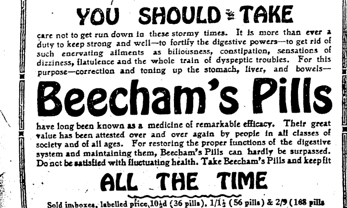 you SHOULD * TAKE care not to get run down in these stormy times. It Is more than ever » duty to keep strong and well—to fortify the digestive powers—to get rid of such enervating ailments as biliousness, constipation, sensations of dizziness, flatulence and the whole train of dyspeptic troubles. For this purpose —correction and toning op the stomach, liver, and bowels I Beecham's Pills \ have long been known as a medicine of remarkable efficacy, Thelf great J ■ value has been attested over and over again by people in all classes of j society and of all ages. For restoring the proper functions of the digestive system and maintaining them, Beecham's Pills can hardly be surpassed. Do net be satisfied with fluctuating health. Take Beecham's Pills and keep fit I S ALL THE TIME Sold pills ) & 2/9 (168 pBl