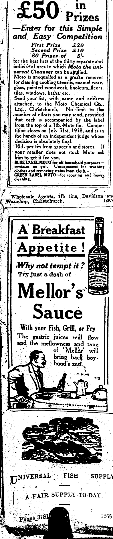 j £50 phU, —Enter for this Simple and Easy Competition Firtt Prize £20 Second Prize £10 f 80 Prize* ■of 5/for the best lists of the thirty separate and individual uses to which' Moto th* uni- . i versed Cleanner can be allied. Ij Moto is unequalled as a grease remover jit. ■ for cleaning cooking utensils, enamel ware, : glass, painted woodwork, linoleum., flcors, . tiles, windows, baths,.etc. . > Send jour list, with name aod address ; attached, to the Moto Chemical Gtv., ft •' Ltd.. Christchurch, No -limit to the '< number of efforts you may send, provided : „ that each is. accompanied by the label * from the top of a lib.-Moto tin. Competition closes on July 31st, 1918, and i» in the hands of an independent judge whose . . decision is absolutely final. lOd. per tm from grocer** and stores. If • Tour retailer does not stock Moto ask him to get it for you. - BUiE Label MO TO for- all household purpose*— ' contaias M grit. Uanipwtd (or wishing -■ • etolhnaad itmwiwi stsms horn doth.. , ' I (Hlttri LABEL MOTO —for scouring uJ heavy J; cleam»f. 7 ?■' ' ■'■ '' f ' . TFljoleaaJe Agent*, lib tins, Davidson anrl ChrMtohnrch. ... H6Ol | A Breakfast H Appetite ! JUL Why not tempt it ? Tryjust a dash of I MellorVH | Sauce With your Fish, Grill, or Fry j The gastric juices will flow : 1 the mtUownew ta.ng ! _ ■ JJNIVERSAL ; FISH SUPPLY * ( •j A FAIR SUPPLY TO-DAY.'