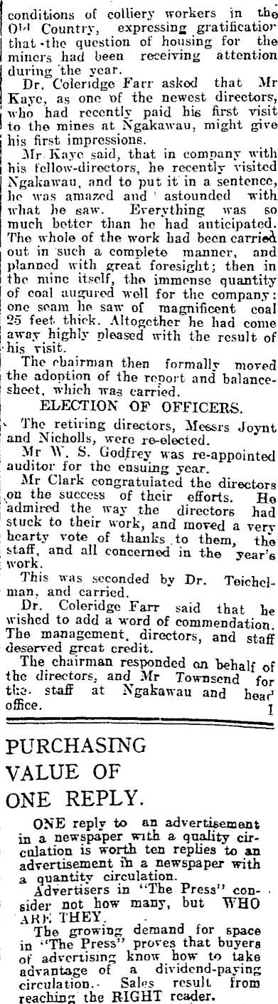 conditions of colliery workers in th e O'' l Country, expressing gratificatior that -the question of housing for the miners had been receiving attention during the year. Dr. Coleridge Farr asked that Mr Kayc, as one of the newest directors, who had recently paid his first visit to the mines at Ngakawau, might give his first impressions. Mr Kayc said, that in company with his fellow-directors, he recently visited Ngakawau, and to put it in a sentence, be was amazed and ' astounded with what he saw. Everything was so much better than he had anticipated. The whole of the work had been carriei out in such a complete manner, and planned with great foresight; then in the mine itself, tho immense quantity of coal augured well for the company: one seam he saw of magnificent coal I 25 feet thick. Altogether he had come away highly pleased with the result of • his visit. J The chairman then formally moved | the adoption of the report and balance- ! sheet, which wa-3 carried, j ELECTION OF OFFICERS, p The retiring directors, Messrs Joynt I and Nicholls, were re-elected, i Mr W. S. Godfrey was re-appointed j auditor for the ensuing year, j Mr Clark congratulated the directors j,on the success of their efforts. He j admired the way the directors had . stuck to their work, and moved a verv hearty vote of thanks .to them, the staff, and all concerned in the year's work. This was seconded by Dr. Teichclman. and carried. Dr. Coleridge Farr said that he wished to add a word of commendation The management, directors, and staff deserved great credit. The chairman responded on behalf of the directors, and Mr Townsend for tka- staff at Ngakawau and hear" office. j PURCHASING VALUE OF ONE REPLY. ONE reply to an advertisement in a newspaper with a quality circulation is worth ten replies to an advertisement fli a newspaper with a quantity circulation. Advertisers in "The Press" con- • sider not how many, but WHO AKK THEY. : The growing demand for space ! in "The Press" proves that buyers i of advertising know how to take advantage of a dividend-paying circulation.- Sales result from reaching the RIGHT reader.