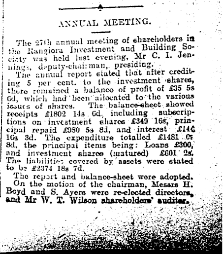 ! _—4 :— ; ■ ■ 1 ■ ! ANNUAL MEETING. ; • > ! The '271 h annual mc-e'.ing of shareholdersia ! tf:e llan?ioia Investment and Building So- : ciaty wu3 hold last evening, Mr C. I. Jen- • iiiriL'-. deputy-thai: man,, presidios* • i Tm> liumial report elated that after creditins 5 per cent, to the investment -shares, there remained a balanco of profit of £35 5s (>d, which had been'allocated to" the vanou* i&>u(s of shares. The ba!iiDCMhe©t. allowed receipts £1802 lis Gd v including subscriptions on' invtatment eliarce £3*9 16ff, principal repaid £030 5a Bd, and • interest £116 10a 3d. Tlie expenditure totalled £1481 .OS Bd, the principal items being: Loans £300, and investment shares (matured) £601/ 24 Th« linbiliti*- covered by'assets were stated : to bi £2374 18s 7d. I 'Xho report and balance-sheet wore adopted. ! On tho motion of the chairman, Messrs H. Boyd and S. Aye re were re-elected director*, .> and Mr W. X. Wilson ahai»holdeo»* auditor., \.J^{
